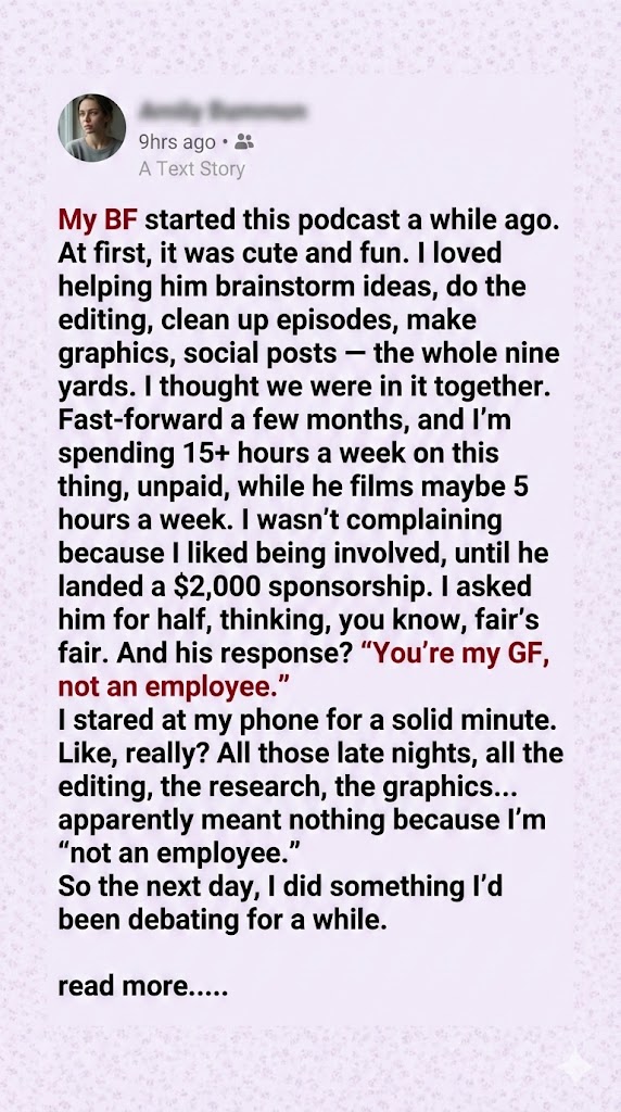I immediately asked him for half, thinking fairness was obvious, given my effort. His response was a slap in the face: “You’re my girlfriend, not an employee.” I just stared at my phone, the shock setting in. All those late nights, the meticulous editing, the hours of research, the design work—it suddenly meant nothing because I wasn’t on his payroll; I was just his free labor.