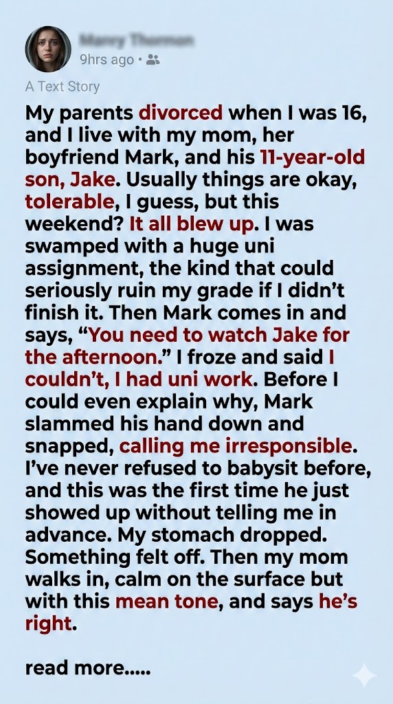 I froze. I said I couldn’t, explaining I had my uni work that was due immediately. Before I could explain further, Mark slammed his hand down on the table and snapped, calling me irresponsible. I was stunned. I’ve never refused to babysit before, and this was the first time he just showed up and told me without any notice. My stomach dropped; something felt deeply off.