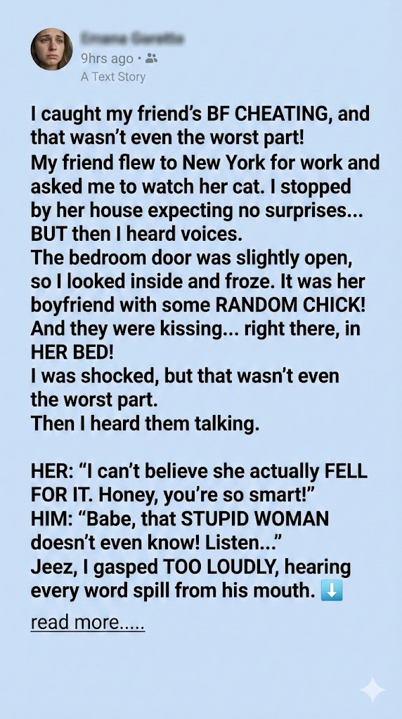 I filled his bowl, poured some water, checked the plants, and the mail. Everything looked normal. Too normal. That’s when I heard it. Laughter. A man’s voice—Mark. And then a woman’s laugh followed.