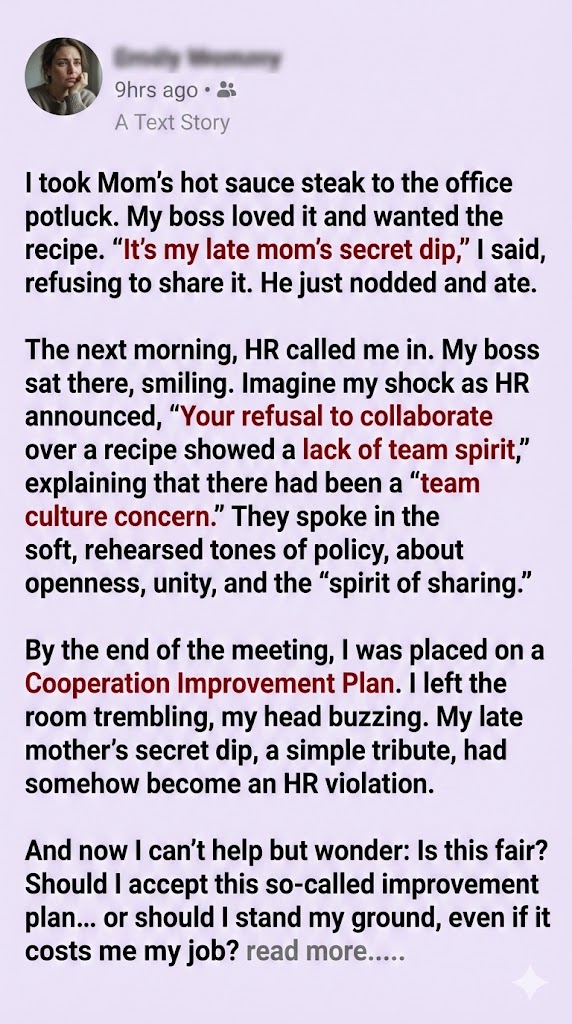 So here’s what I’ve learned: boundaries aren’t barriers—they’re bridges to self-respect. I refused to give my late mom’s secret recipe to my boss, and HR stepped in to protect more than just my rights. They protected my story. And now, every time I bake, I do it with pride, knowing that some things are meant to stay sacred. Because legacy isn’t about sharing everything—it’s about honoring what matters most.