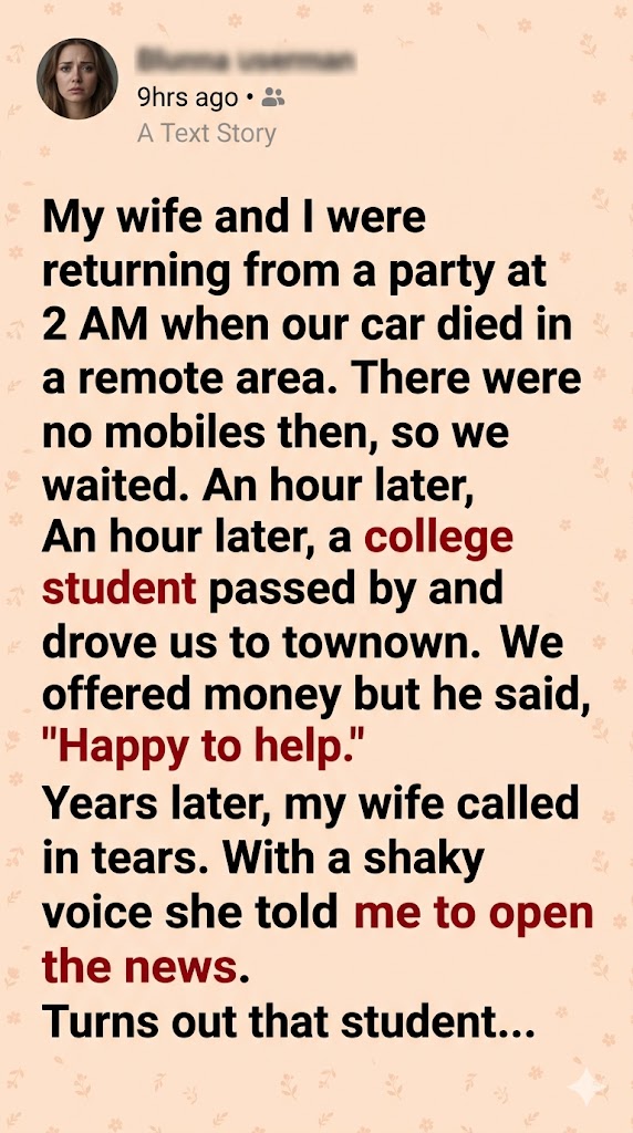 My wife and I were returning from a party at 2 AM when our car died in a remote area. There were no mobiles then, so we waited. An hour later, a college student passed by and drove us to town. We offered money but he said, “Happy to help.” Years later, my wife called in tears. With a shaky voice she told me to open the news. Turns out that student…was a wanted man.