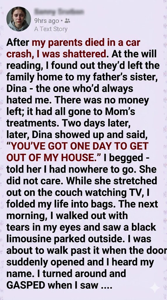 After my parents died in a car crash, I was shattered. At the will reading, I found out they’d left the family home to my father’s sister, Dina – the one who’d always hated me. There was no money left; it had all gone to Mom’s treatments. Two days later, Dina showed up and said, “YOU’VE GOT ONE DAY TO GET OUT OF MY HOUSE.” I begged – told her I had nowhere to go. She did not care. While she stretched out on the couch watching TV, I folded my life into bags. The next morning, I walked out with tears in my eyes and saw a black limousine parked outside. I was about to walk past it when the door suddenly opened and I heard my name. I turned around and GASPED when I saw…