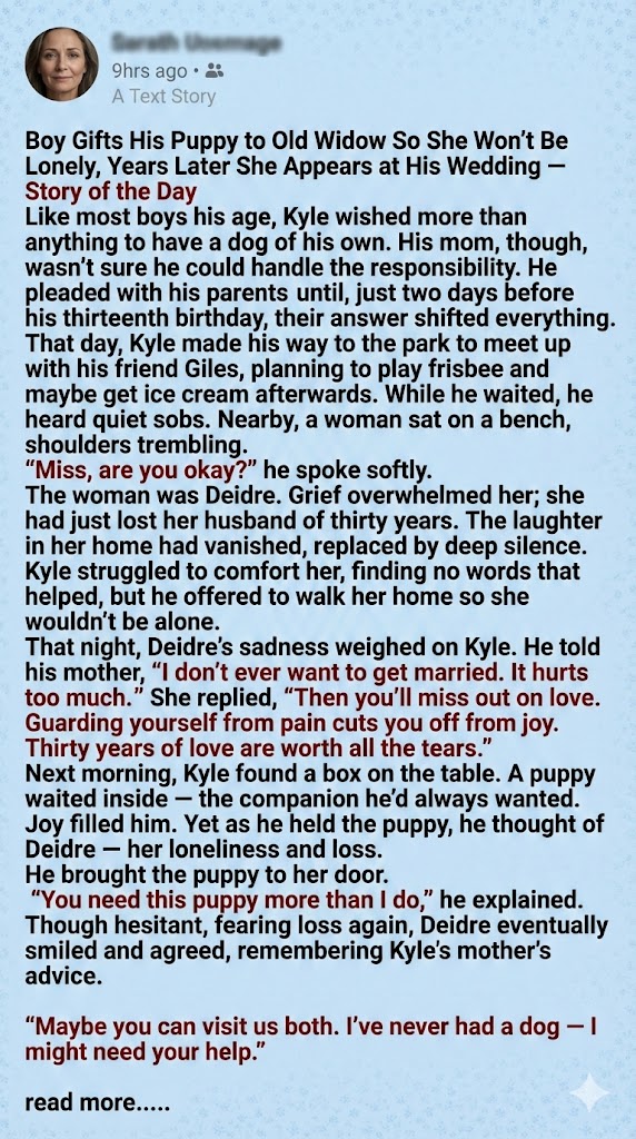 The next morning, Kyle’s parents gave him a shelter puppy with big, soulful eyes. Overjoyed, he hugged the dog—then remembered Deidre’s loneliness. Hours later, he knocked on her door, pup in arms.