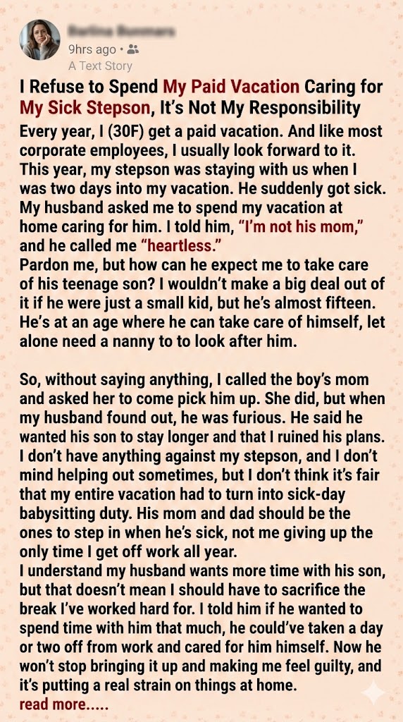This year, my stepson was staying with when I was two days into my vacation. He suddenly got sick. My husband asked me to spend my vacation at home caring for him. I told him, “I’m not his mom,” and he called me “heartless.”