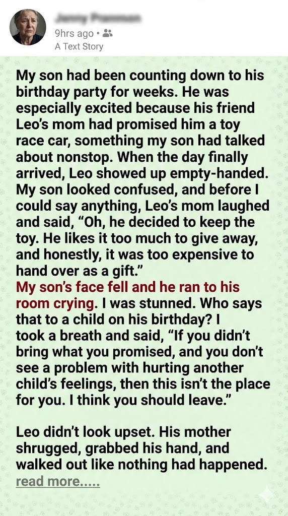 I took a deep, steadying breath. I knew I had to take a firm stand for my child. I turned to Leo’s mom and spoke in a clear, measured voice: “If you came here without the gift you promised, and you truly don’t see a problem with deliberately hurting a child’s feelings this way, then this is absolutely not the place for you. I think you should leave right now.” Leo didn’t even look upset by the confrontation. His mother simply shrugged with total indifference, grabbed his hand, and walked out of the party like nothing of any consequence had happened at all.