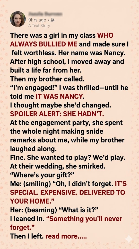 When my brother announced his engagement, I was thrilled, until he told me he was marrying the girl who made my childhood miserable. She thought the past was forgotten, but I had the perfect wedding gift to remind her that some scars don’t fade.