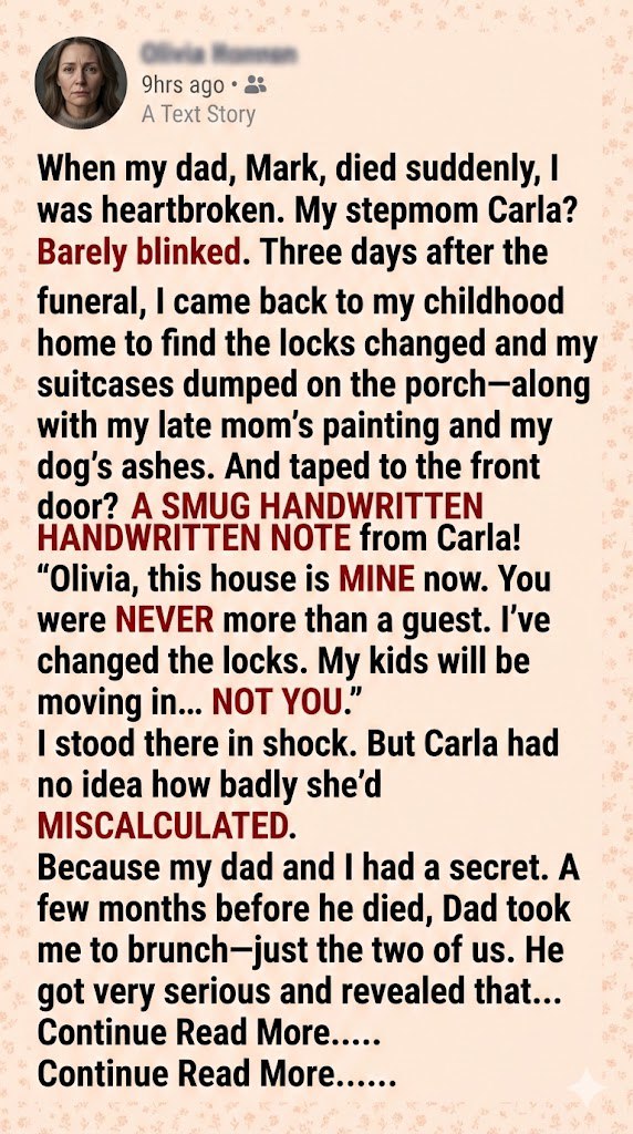 When my dad, Mark, died suddenly, I was heartbroken. My stepmom Carla? Barely blinked. Three days after the funeral, I came back to my childhood home to find the locks changed and my suitcases dumped on the porch—along with my late mom’s painting and my dog’s ashes. And taped to the front door? A SMUG HANDWRITTEN NOTE from Carla!