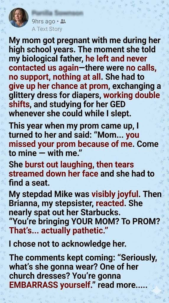 My mom became a parent at 17. She gave up her entire adolescence for me, including the prom she’d dreamed about since middle school. The guy who got her pregnant vanished the second she told him—no goodbye, no support, no curiosity. Mom faced everything alone. College applications went in the trash; her prom dress stayed in the store. She juggled crying kids she babysat, worked graveyard shifts at a truck stop diner, and cracked open GED textbooks after I finally dozed off.