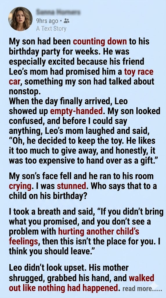 I took a deep, steadying breath. I knew I had to take a firm stand for my child. I turned to Leo’s mom and spoke in a clear, measured voice: “If you came here without the gift you promised, and you truly don’t see a problem with deliberately hurting a child’s feelings this way, then this is absolutely not the place for you. I think you should leave right now.” Leo didn’t even look upset by the confrontation. His mother simply shrugged with total indifference, grabbed his hand, and walked out of the party like nothing of any consequence had happened at all.