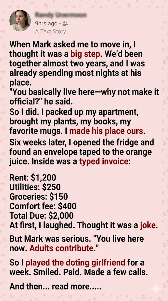 Relationships aren’t supposed to be about invoices and fees. They’re supposed to be about give and take, about sharing without keeping score. But lying there, I couldn’t shake the feeling that Mark saw me less as a partner and more as a tenant in his carefully managed life.