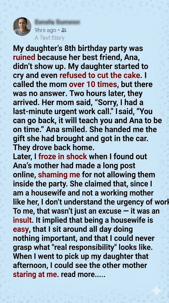 The backlash came quickly. Other parents started weighing in. Some said I was teaching a valuable lesson. Others said I was being too rigid. But I didn’t waver. I believe children learn from consequences, and Mia’s chronic lateness had always been dismissed. This time, it wasn’t. I wasn’t trying to shame her—I was trying to show that being late has real effects. My daughter saw that her party had structure, and that her mom stood up for it. That mattered more than being liked.