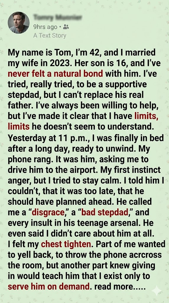 I told him firmly that I absolutely could not drive him, explaining that it was too late and that he should have been responsible enough to plan ahead for such a necessary journey. His response was immediate and vicious. He unleashed every sharp insult in his teenage arsenal, escalating quickly from calling me a “disgrace” to a “bad stepdad,” finishing with the cruelest blow, saying that I clearly didn’t care about him at all. His words were designed to wound, and they certainly hit their mark. I felt my entire chest constrict with a combination of hurt and pure, boiling frustration. A part of me desperately wanted to retaliate, to yell back or simply throw the phone across the room just to release the tension that was gripping me.