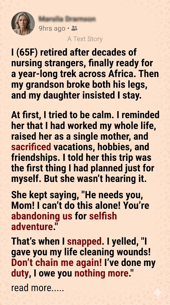 I was 65, and after decades spent as a nurse caring for strangers, I was finally ready for my life to begin. I had meticulously planned a year-long trek across Africa—the first great adventure I had ever arranged solely for myself. I retired after giving my entire career and raising my daughter as a single mother, sacrificing countless vacations, hobbies, and friendships along the way. This trip was not merely a holiday; it was the culmination of a lifelong deferred dream, a promise I finally made to myself. I had packed my bags and sorted my affairs, my heart brimming with a sense of freedom and excitement I hadn’t felt in years, ready to step onto that plane and embrace the unknown.