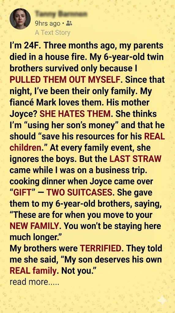 My work required me to travel for the first time since the fire—a brief, two-night absence. Mark remained home, and everything seemed normal until I walked back through our front door. Caleb and Liam immediately burst out of their room, sobbing hysterically, completely inconsolable. I dropped my luggage right there on the mat, frantically trying to decipher their terror-filled, confused words. After forcing them to take deep, shuddering breaths, the horrifying story finally unfolded. Grandma Joyce had visited under the pretense of bearing “gifts” while Mark was busy cooking. She had presented the boys with two small, perfectly packed suitcases, complete with their own clothes and toothbrushes. Then, with wicked composure, she delivered the devastating lie: “These are for when you move to your new family soon.” She further poisoned their minds by claiming, “Your sister only takes care of you because she feels guilty.” She left them weeping and panicked, knowing precisely what profound fear she had inflicted upon my boys.