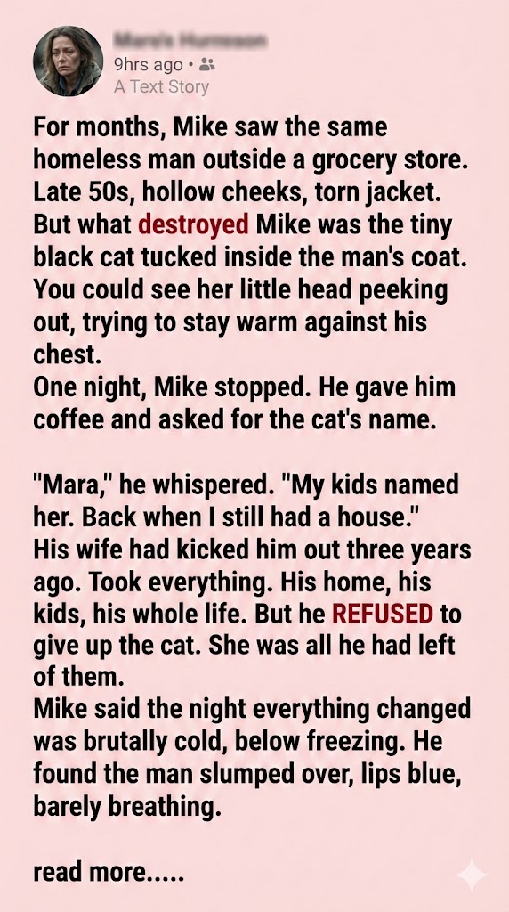 A man, Mike, walked past, but then, for some reason, he turned around. He bought a hot coffee and walked back, ignoring the rules of the invisible world. He simply asked, “Hey. Does she have a name?” I managed to rasp, my voice cracking, “Mara. My kids named her. Long time ago.” That single line—the mention of my children—it cracked something wide open inside me. Mike didn’t plan to get involved, but after that first night, he started showing up on purpose. He brought me sandwiches, gloves, and once, tuna just for Mara. I told him he didn’t have to do it, but he always replied, “I know. But I want to.”