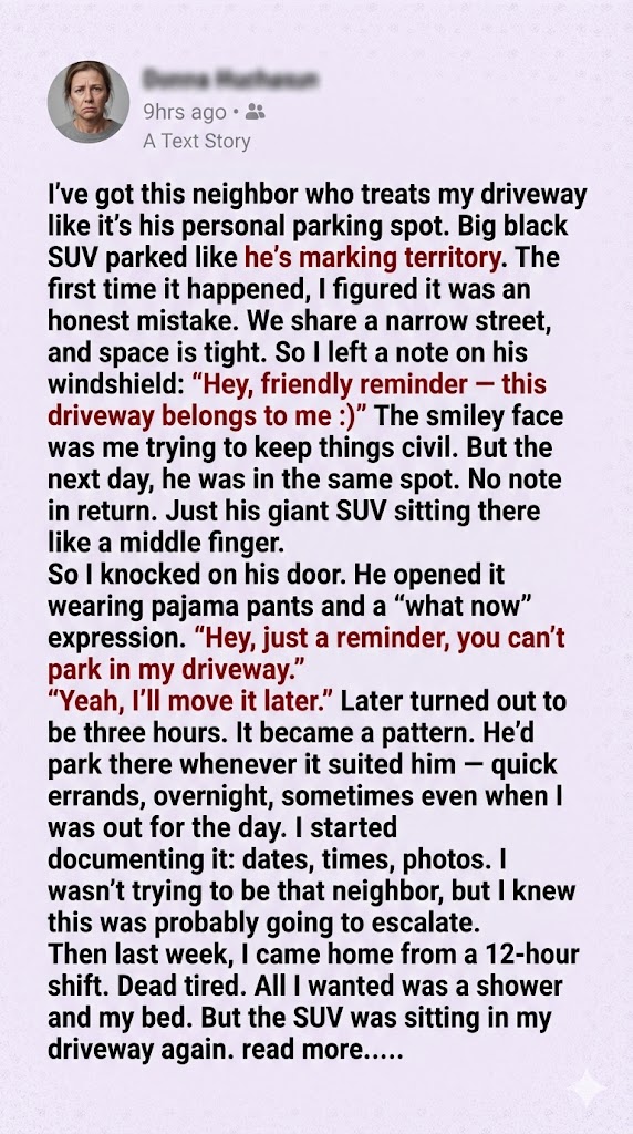 I’ve got this neighbor who treated my driveway like his personal parking spot. At first, I gave him the benefit of the doubt—maybe it was a mistake. But it kept happening. His big black SUV would be sitting there like it owned the place, blocking me after long shifts and making my life harder than it needed to be. I left polite notes, knocked on his door, even asked him face-to-face to stop. He’d nod, apologize, and then do it again the next day. It wasn’t just inconsiderate—it was blatant disrespect. And I’d had enough.