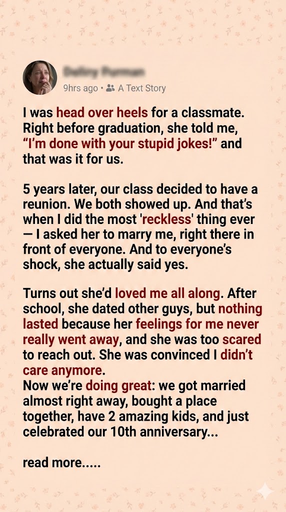 He had been hopelessly in love with a classmate, the kind who made his heart race with every glance. But just before graduation, she snapped, “I’m done with your stupid jokes!” and walked away. That was the end of their story—or so he thought. Life moved on, and five years passed in silence. Then came the class reunion, and they both showed up, older but still carrying echoes of the past.