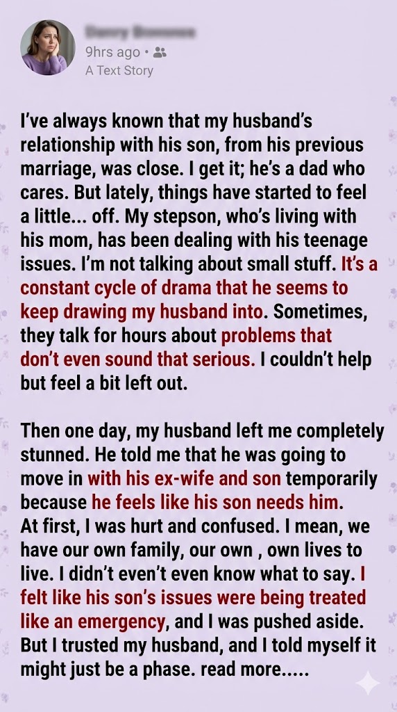 Then came the shock: my husband announced he was moving in with his ex-wife and son “temporarily.” He said his son needed him, but what about me? What about our family? I felt blindsided, discarded—like our life together was suddenly negotiable. I tried to be understanding, hoping it was just a phase, but the pain of being pushed aside lingered.
