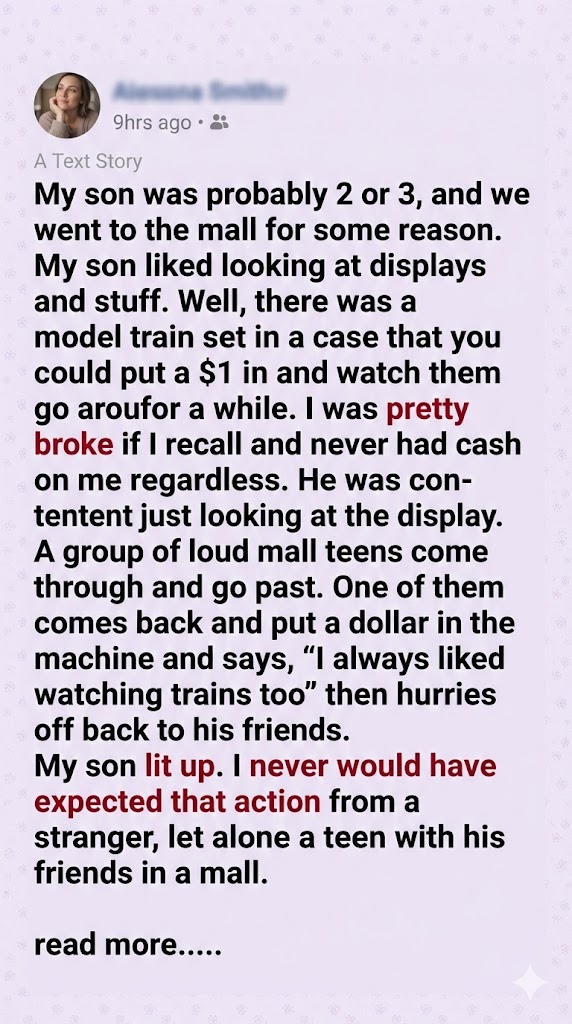 At a quiet mall on an ordinary afternoon, a young mother wandered with her toddler son, who was about two or three. He loved looking at displays, and one in particular caught his eye—a model train set behind glass. For a dollar, the trains would run in circles, whistling and chugging. She didn’t have the cash, and her son didn’t ask. He was content just watching, his little face pressed to the glass.