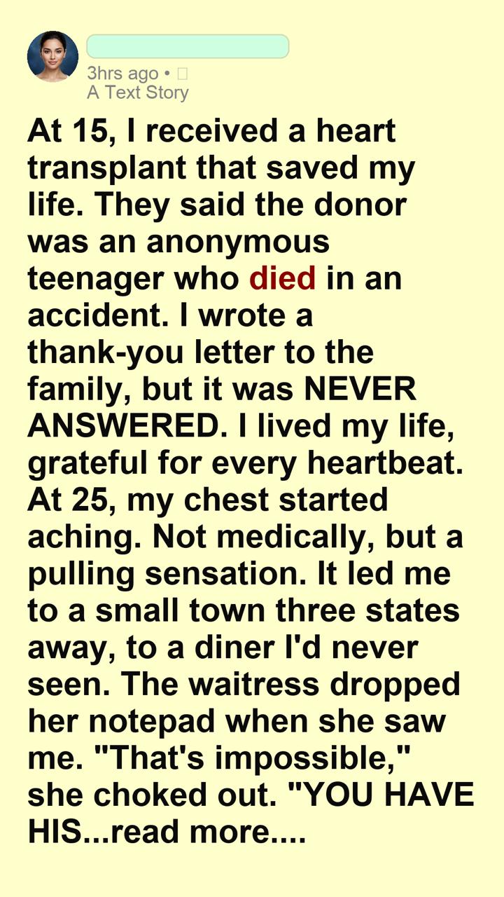 “I… I received a heart transplant ten years ago,” I stammered, the words tumbling out before I could stop them. “They told me the donor was an anonymous teenager who died in a car accident. I wrote a letter to the family, but—”