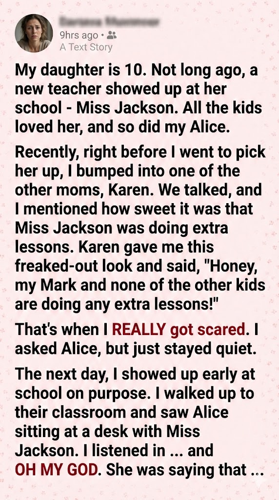 My daughter is 10. Not long ago, a new teacher showed up at her school – Miss Jackson. All the kids loved her, and so did my Alice. Recently, right before I went to pick her up, I bumped into one of the other moms, Karen. We talked, and I mentioned how sweet it was that Miss Jackson was doing extra lessons. Karen gave me this freaked-out look and said, ‘Honey, my Mark and none of the other kids are doing any extra lessons!’ That’s when I REALLY got scared. I asked Alice, but she just stayed quiet. The next day, I showed up early at school on purpose. I walked up to their classroom and saw Alice sitting at a desk with Miss Jackson. I listened in … and OH MY GOD. She was saying that …