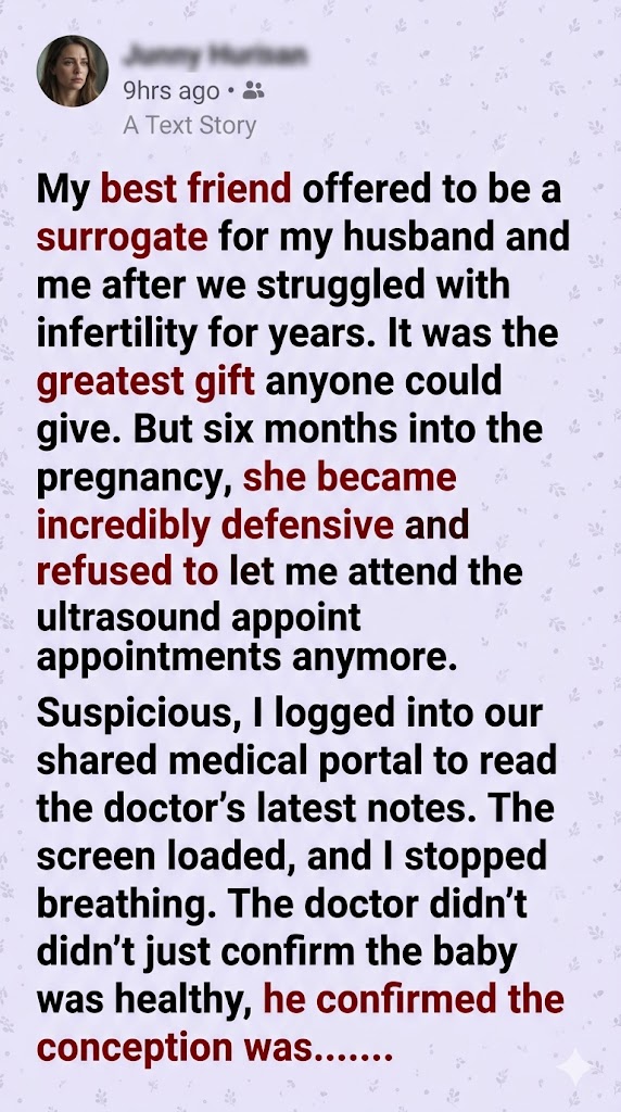 I stared at the glowing blue screen, the clinical black text blurring as my heart pounded a frantic rhythm against my ribs. Natural conception. It wasn’t our fertilized embryo growing inside my best friend, Elena. It was just a baby.
