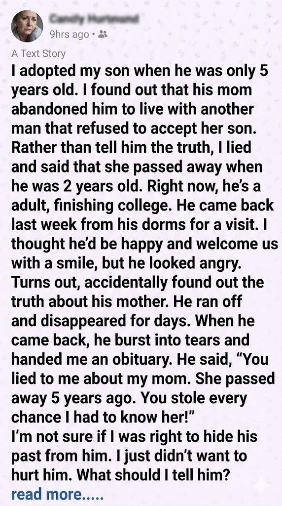 When my wife left, our son was just a toddler. She walked out without a goodbye, chasing a life that didn’t include us. I was shattered, but I told him she died. I thought it would be easier than explaining abandonment. For years, he mourned a mother he never really lost. I kept the lie alive through birthdays, school plays, and quiet tears. But when he turned sixteen, he found her online—alive, thriving, and completely unaware of the grief she’d caused. He confronted me, devastated. My lie, meant to protect, had become the wedge that shattered our bond. I lost him twice.
