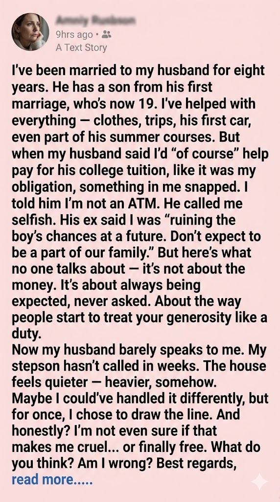I’ve been married to my husband for eight years, and his son from a previous marriage has always been part of our lives. I helped with everything—clothes, vacations, his first car, even summer courses. I never complained. But when my husband casually said I’d “of course” help pay for his college tuition, something snapped. It wasn’t a discussion—it was an expectation. I told him I’m not an ATM. He looked shocked, called me selfish. His ex even chimed in, saying I was “ruining the boy’s future.” But I wasn’t refusing out of spite—I was refusing because I finally saw the pattern.