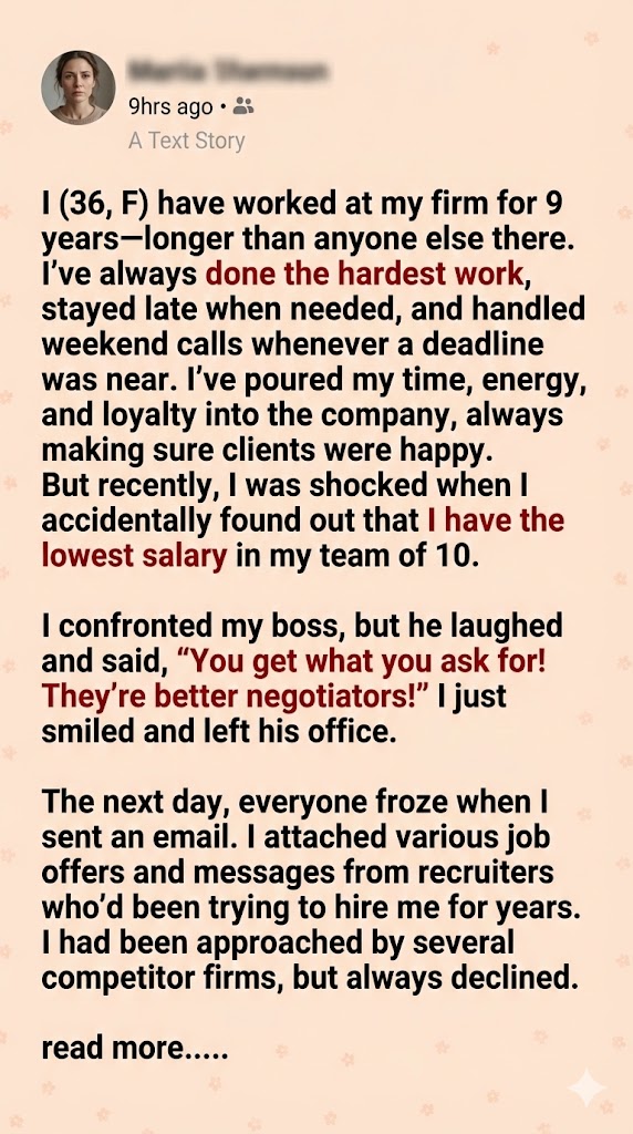 I’ve been with this company for over 15 years. I’ve trained half the team, solved crises, and stayed loyal through mergers and layoffs. So when I found out I had the lowest salary on my team—despite being the oldest and most experienced—I felt betrayed. Younger colleagues with half my tenure were earning more. I wasn’t asking for special treatment—I was asking for fairness.