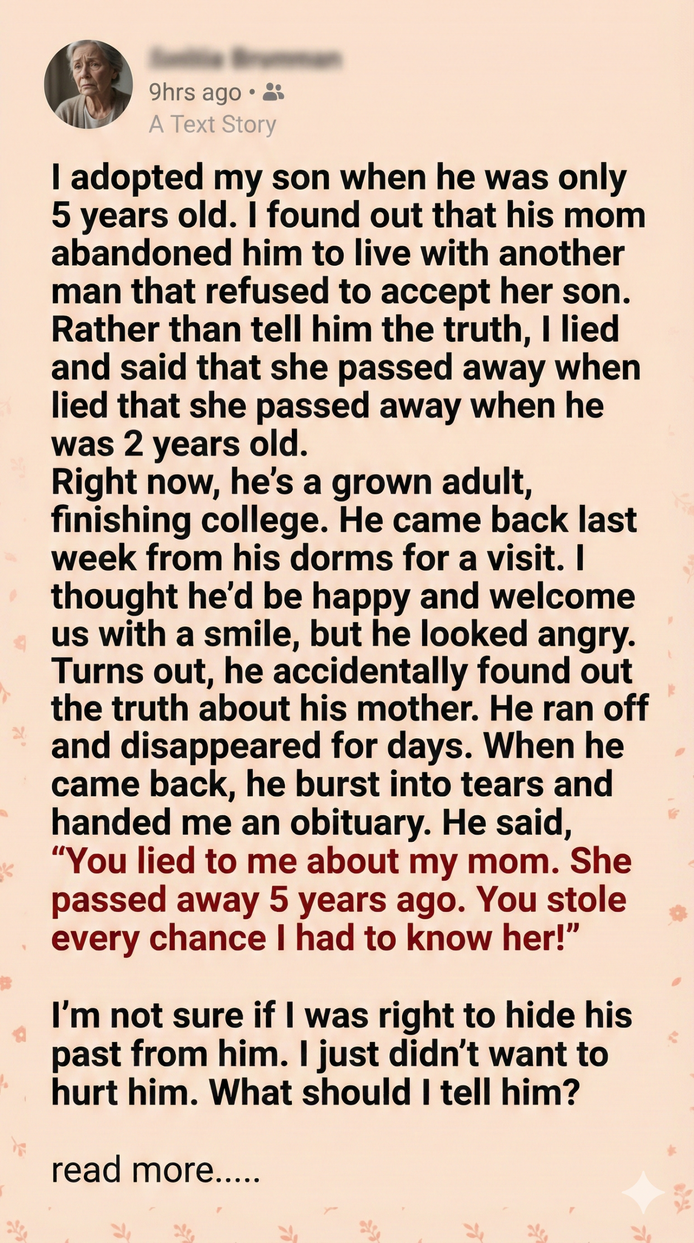 I told myself it was mercy. That sparing him the pain of rejection was better than letting him know she chose to leave. But every time he asked about her, I felt the weight of my decision. I crafted stories, painted her as a saint, and watched him build a fantasy around a ghost.