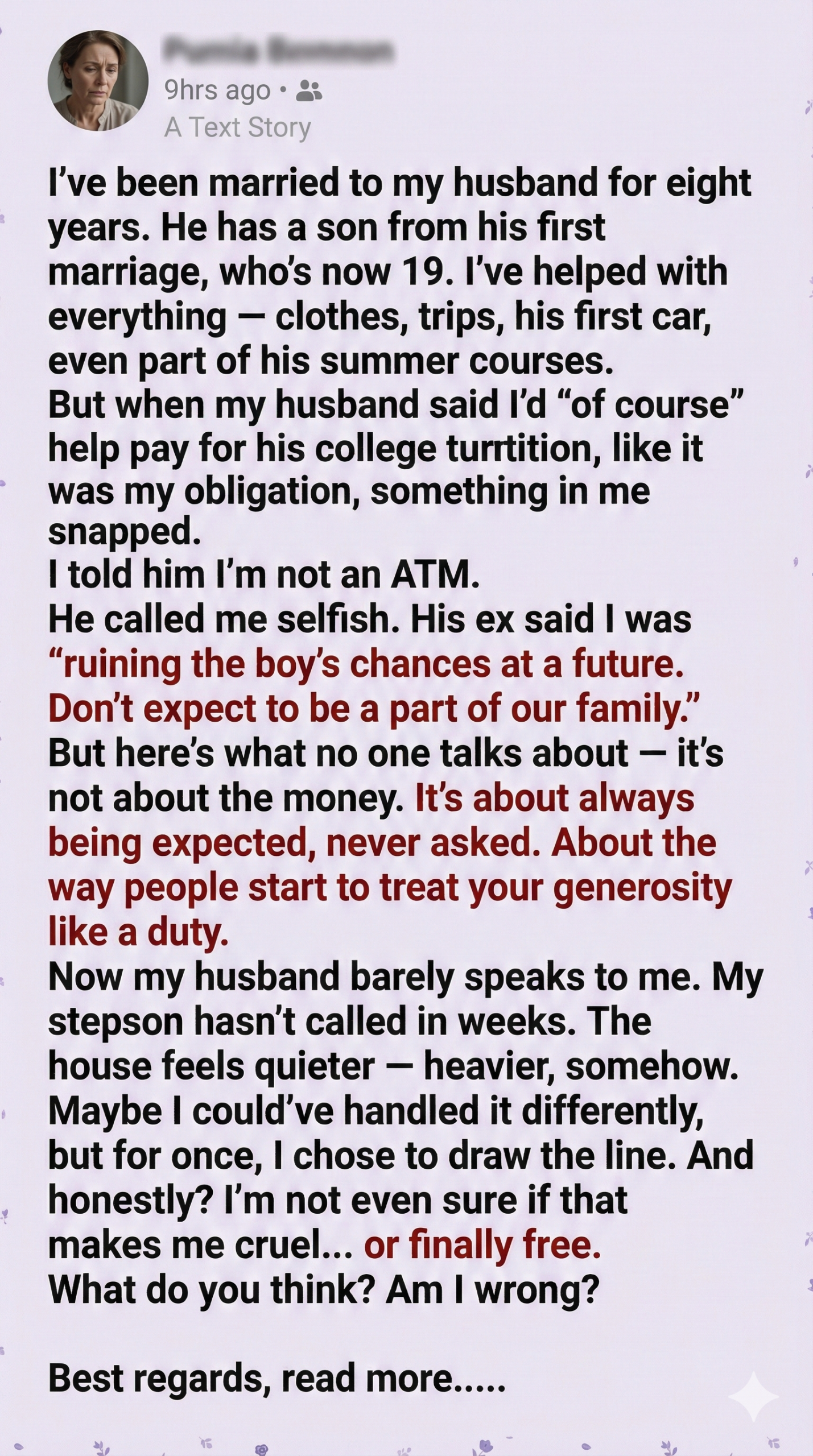 I’ve been married to my husband for eight years, and his son from a previous marriage has always been part of our lives. I helped with everything—clothes, vacations, his first car, even summer courses. I never complained. But when my husband casually said I’d “of course” help pay for his college tuition, something snapped. It wasn’t a discussion—it was an expectation. I told him I’m not an ATM. He looked shocked, called me selfish. His ex even chimed in, saying I was “ruining the boy’s future.” But I wasn’t refusing out of spite—I was refusing because I finally saw the pattern.