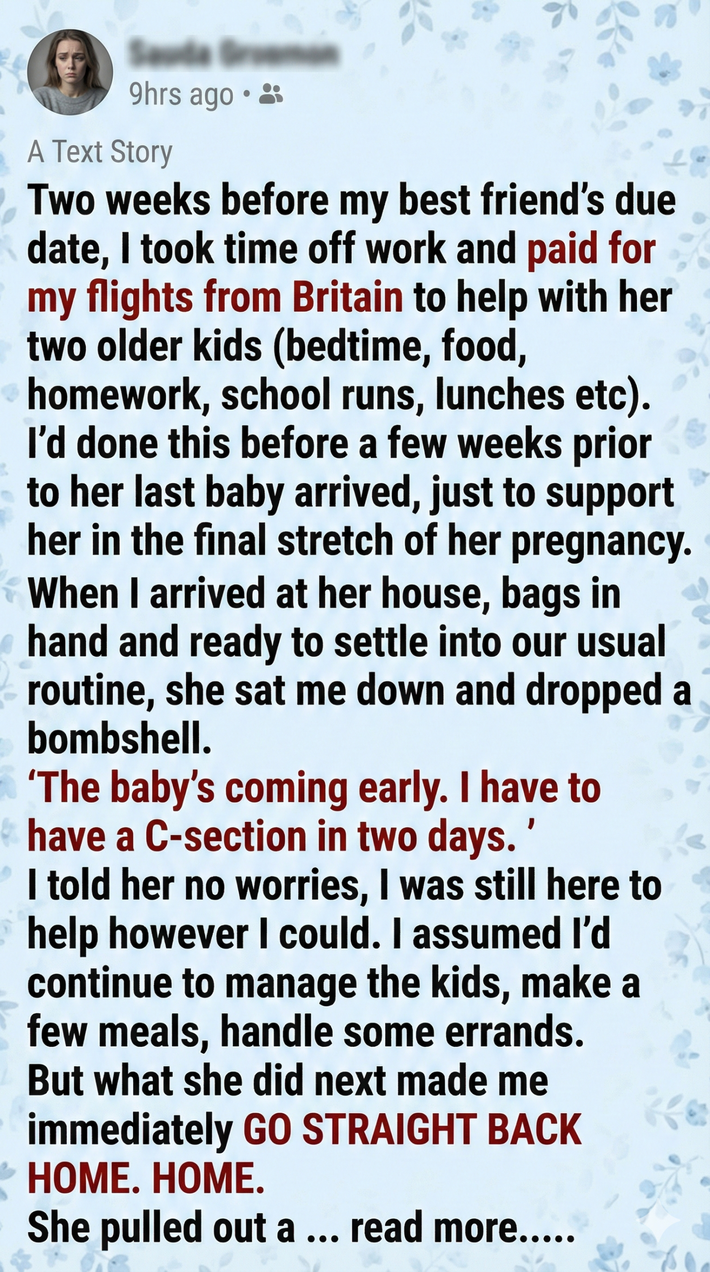 Two weeks before my best friendâs due date, I took time off work and paid for my flights from Britain to help with her two older kids (bedtime, food, homework, school runs, lunches etc).