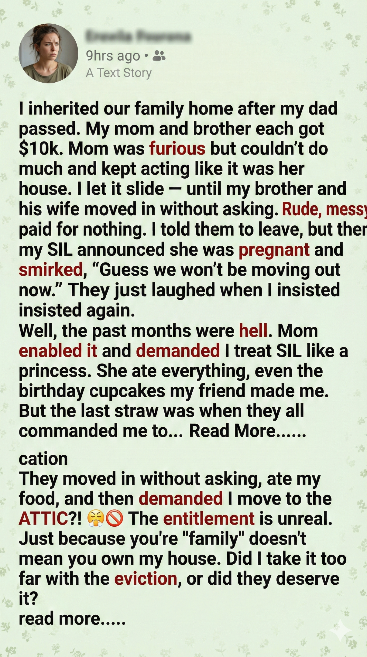 The look on my SIL’s face when two officers told them they had 15 minutes to grab their essentials and vacate the premises was worth every penny of the legal fees. She started screaming, “I’m pregnant! You can’t do this!” The officer calmly replied, “Ma’am, that doesn’t give you the right to trespass.”