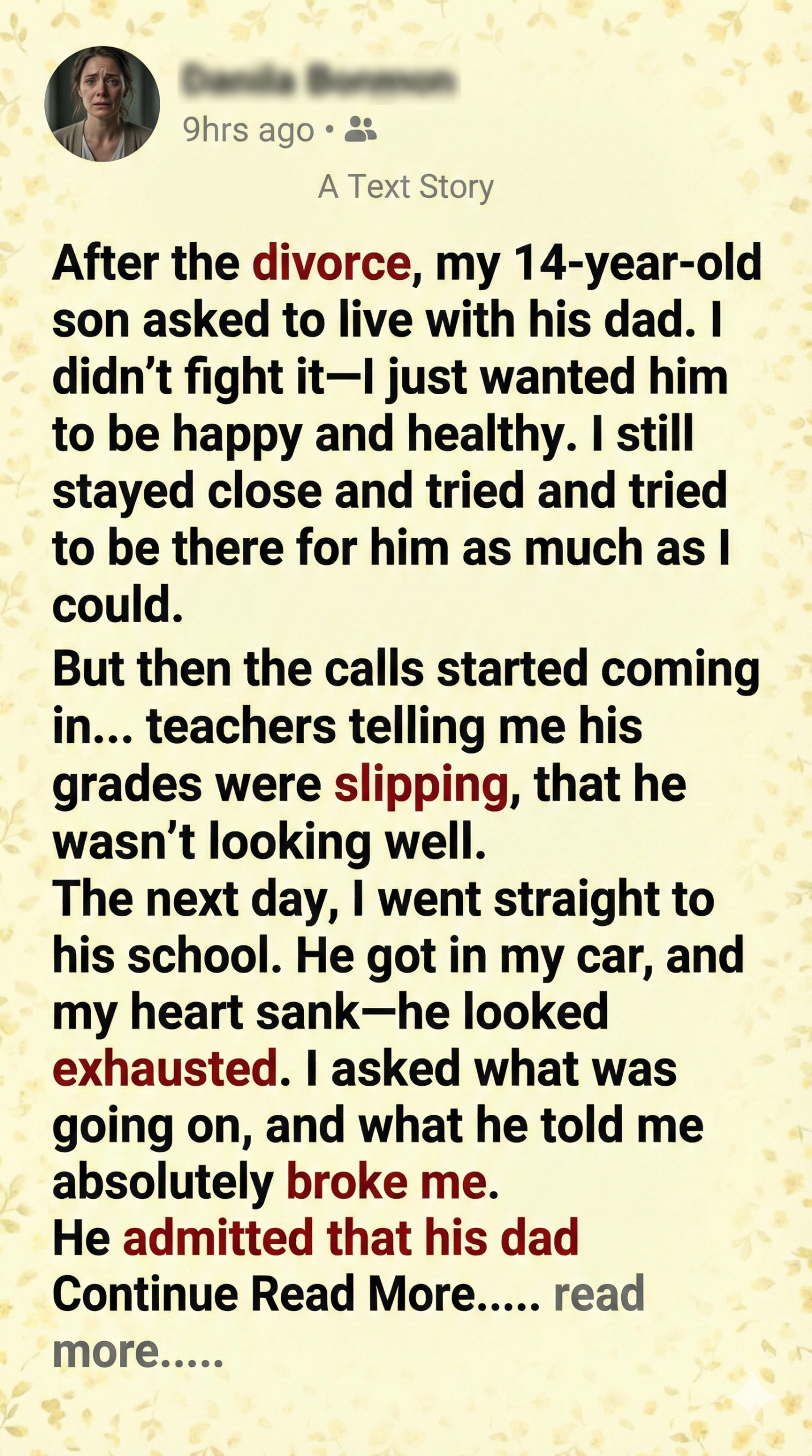 But then the calls started coming in… teachers telling me his grades were slipping, that he wasnât looking well. The next day, I went straight to his school. He got in my car, and my heart sankâhe looked exhausted.