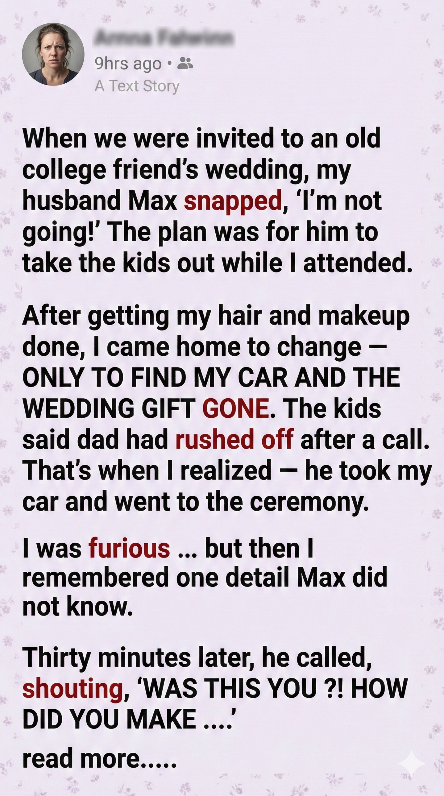 After getting my hair and makeup done, I came home to change â ONLY TO FIND MY CAR AND THE WEDDING GIFT GONE. The kids said dad had rushed off after a call. Thatâs when I realized â he took my car and went to the ceremony.