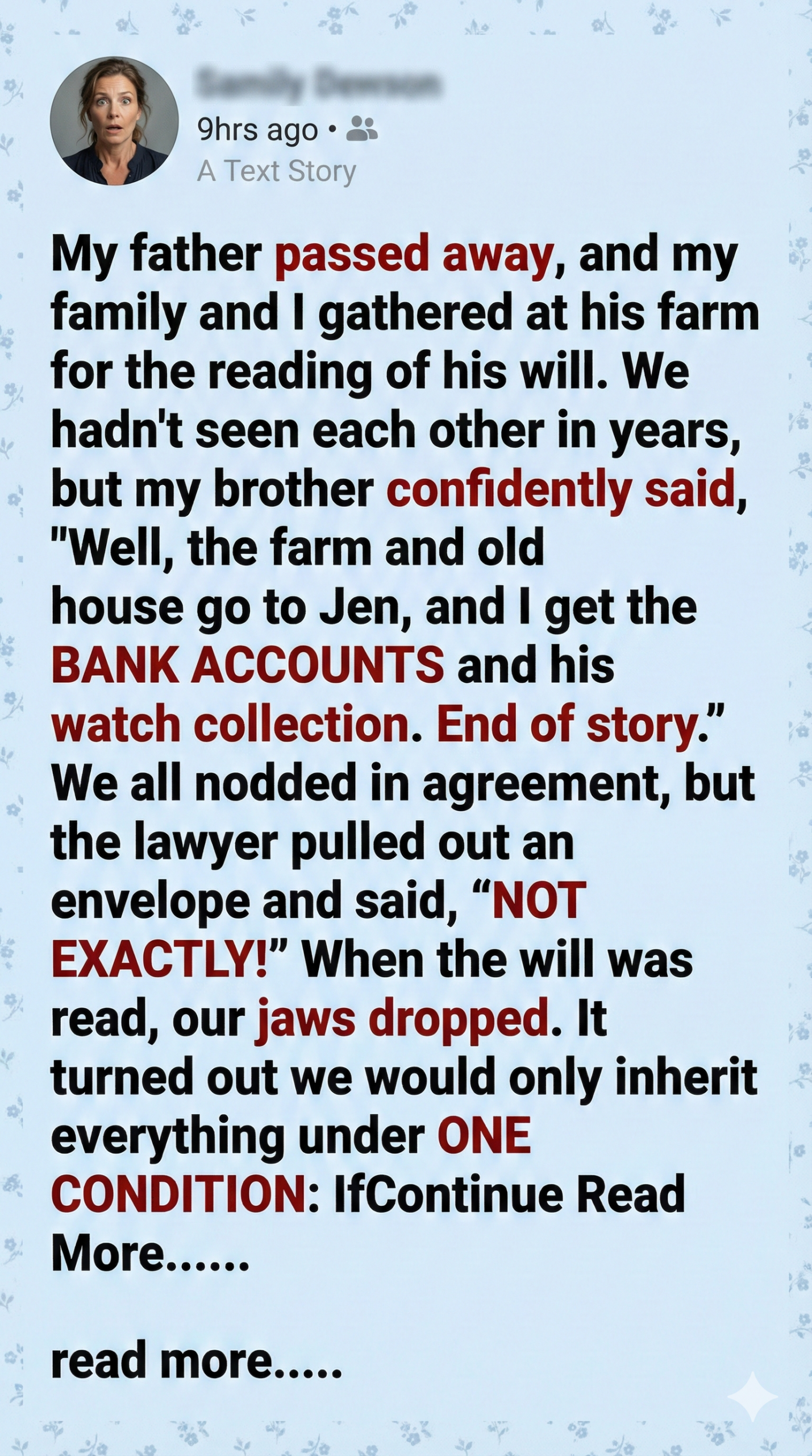 My father passed away, and my family and I gathered at his farm for the reading of his will. We hadn’t seen each other in yearsāmostly because of money disputes and petty argumentsābut my brother, Mark, walked in looking smug.