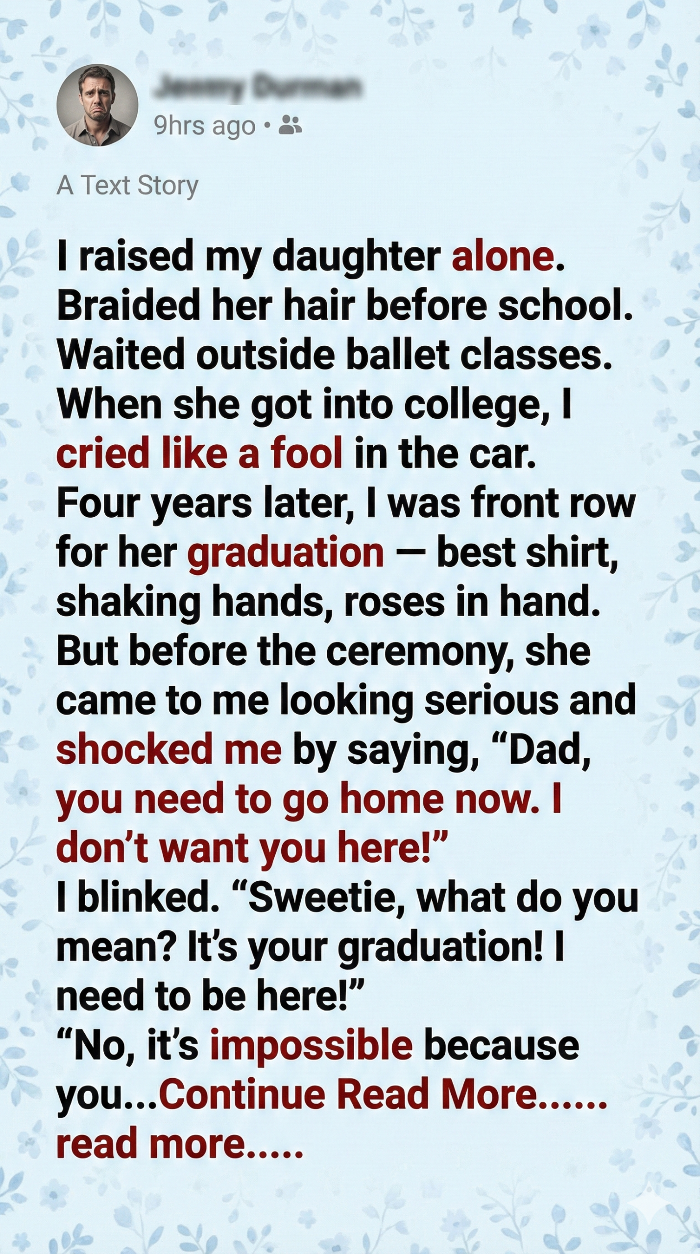 Four years later, I was front row for her graduation — best shirt, shaking hands, roses in hand. But before the ceremony, she came to me looking serious and shocked me by saying, “Dad, you need to go home now. I don’t want you here!”