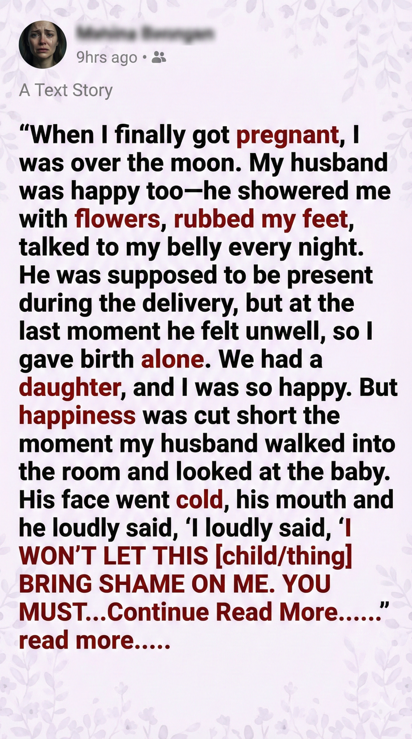 We had a daughter, and I was so happy. But my happiness was cut short the moment my husband walked into the room and looked at the baby. His face went cold, his mouth twisted, and he loudly said, “I WONâT LET THIS THING BRING SHAME ON ME. YOU MUST GET RID OF IT OR LEAVE.”