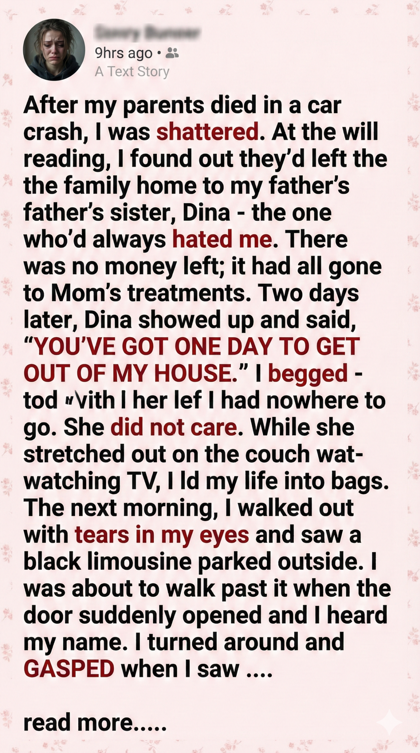 After my parents died in a car crash, I was shattered. At the will reading, I found out they’d left the family home to my father’s sister, Dina – the one who’d always hated me. There was no money left; it had all gone to Mom’s treatments. Two days later, Dina showed up and said, “YOU’VE GOT ONE DAY TO GET OUT OF MY HOUSE.” I begged – told her I had nowhere to go. She did not care. While she stretched out on the couch watching TV, I folded my life into bags. The next morning, I walked out with tears in my eyes and saw a black limousine parked outside. I was about to walk past it when the door suddenly opened and I heard my name. I turned around and GASPED when I saw…