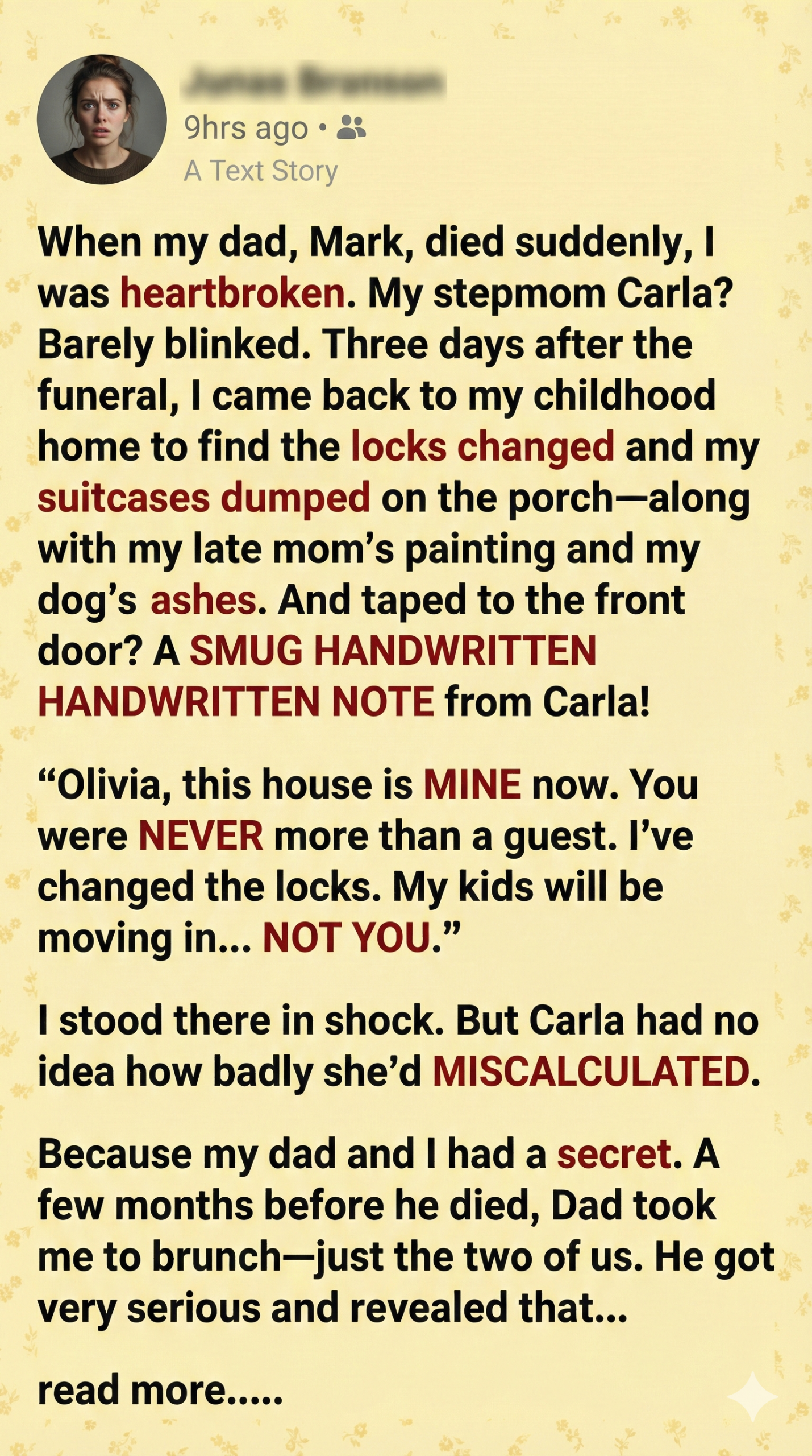 When my dad, Mark, died suddenly, I was heartbroken. My stepmom Carla? Barely blinked. Three days after the funeral, I came back to my childhood home to find the locks changed and my suitcases dumped on the porch—along with my late mom’s painting and my dog’s ashes. And taped to the front door? A SMUG HANDWRITTEN NOTE from Carla!