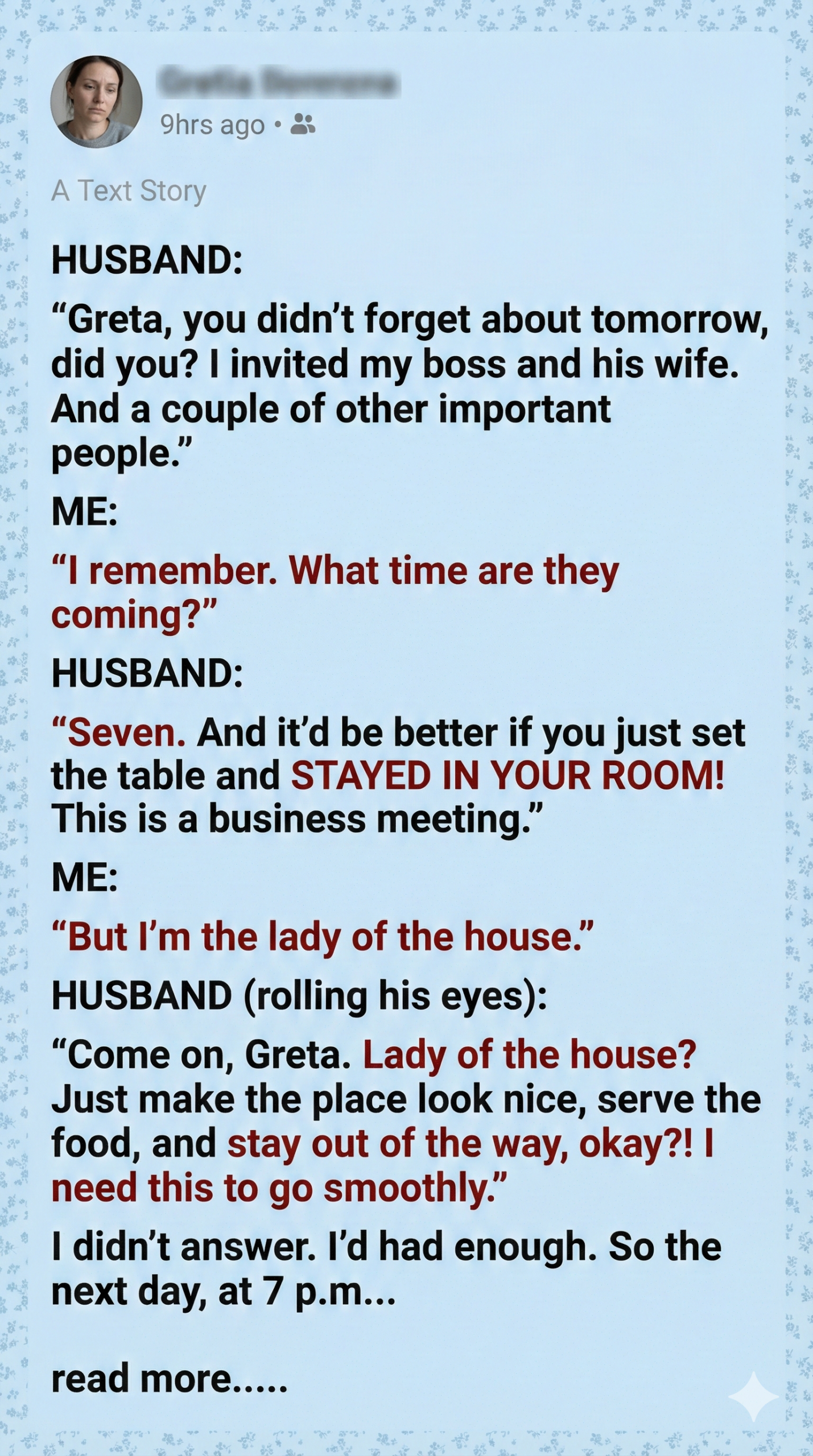 “Come on, Greta. Lady of the house? Just make the place look nice, serve the food, and stay out of the way, okay? I need this to go smoothly.”