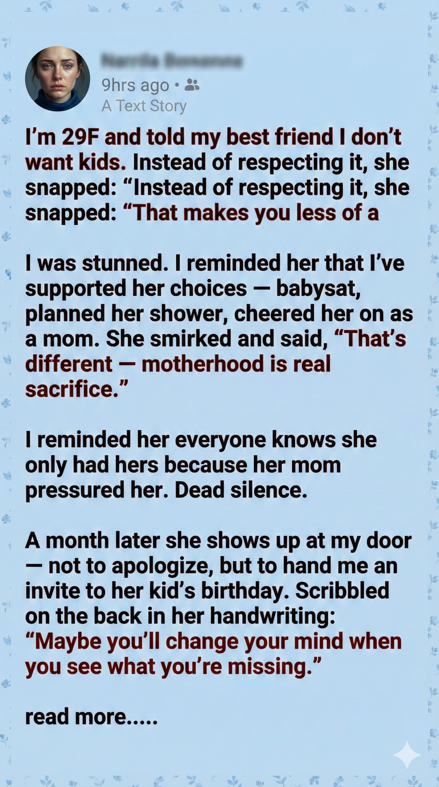 After that conversation, I started questioning our friendship. How could someone who claimed to care about me be so dismissive of my choices? I replayed her words over and over, wondering if I’d missed signs of this mindset before. Maybe I had. Maybe I’d ignored the subtle digs, the assumptions, the pressure. But now it was loud and clear: she saw me as incomplete. And I couldn’t unhear that.