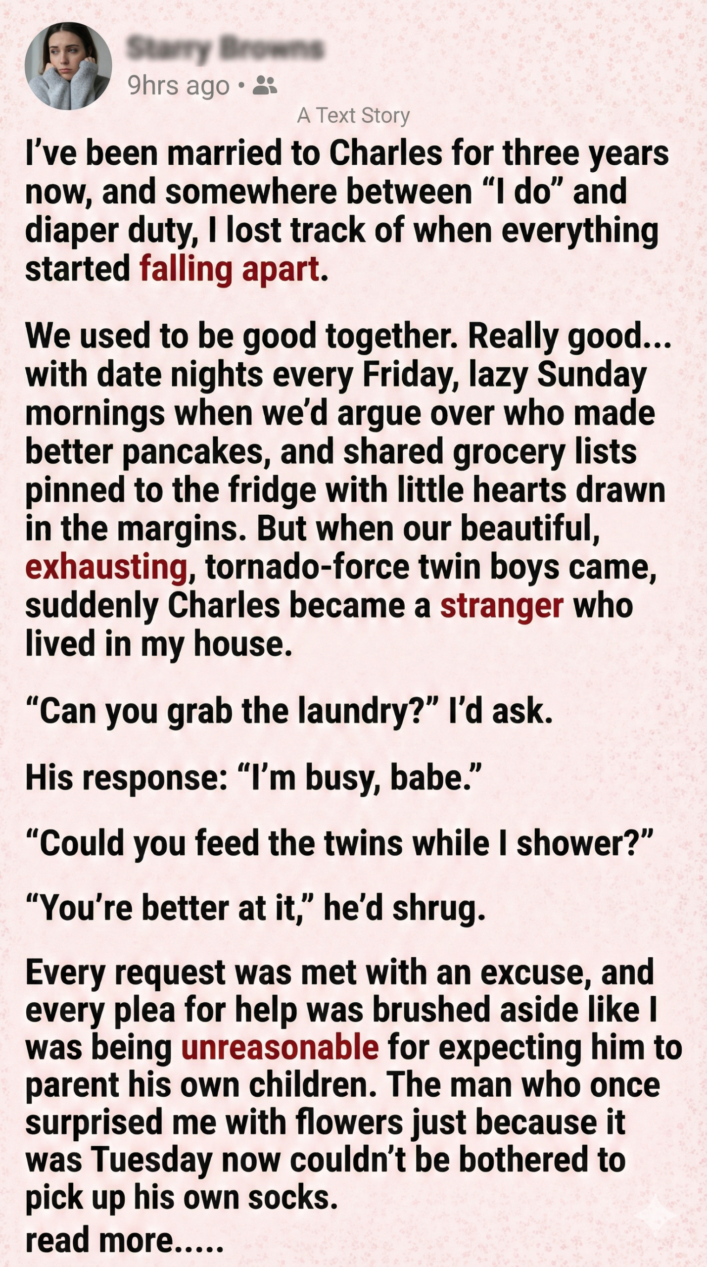 At my mom’s, I found peace. No judgment, no passive-aggression—just help and kindness. Charles texted on day two, desperate for sleep tips. By day three, I returned briefly to grab documents and found the house in chaos. Betty was yelling, Charles was overwhelmed, and the twins were screaming. I said nothing. Just walked out. On day five, they showed up at my mom’s—disheveled, exhausted, and begging me to come home. But I wasn’t ready to forgive. Not yet. Not without change. I laid out my terms, and this time, I meant every word.