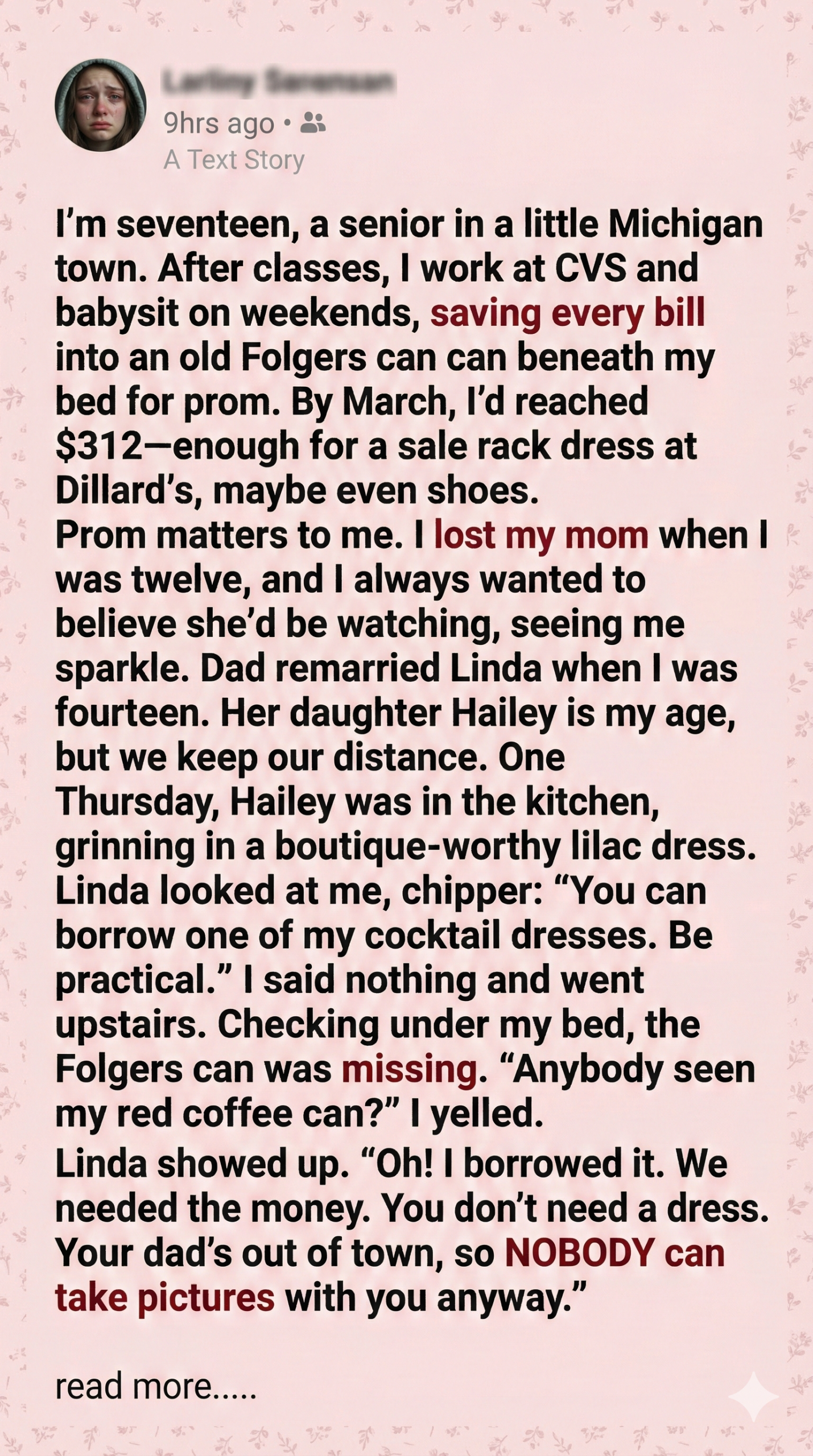 I’d spent months saving every crumpled dollar from babysitting and stocking shelves at CVS, dreaming of a prom dress that would make me feel like I belonged. My mom, who passed when I was twelve, used to say, “I want your life to have sparkle.” That sparkle lived in a red coffee can under my bed—until the morning I found it gone. My stepmom had stolen it, claiming it was for bills, but I saw the receipt for my stepsister’s $489 boutique dress. I was told to be “practical.” I was told I wasn’t going to prom.