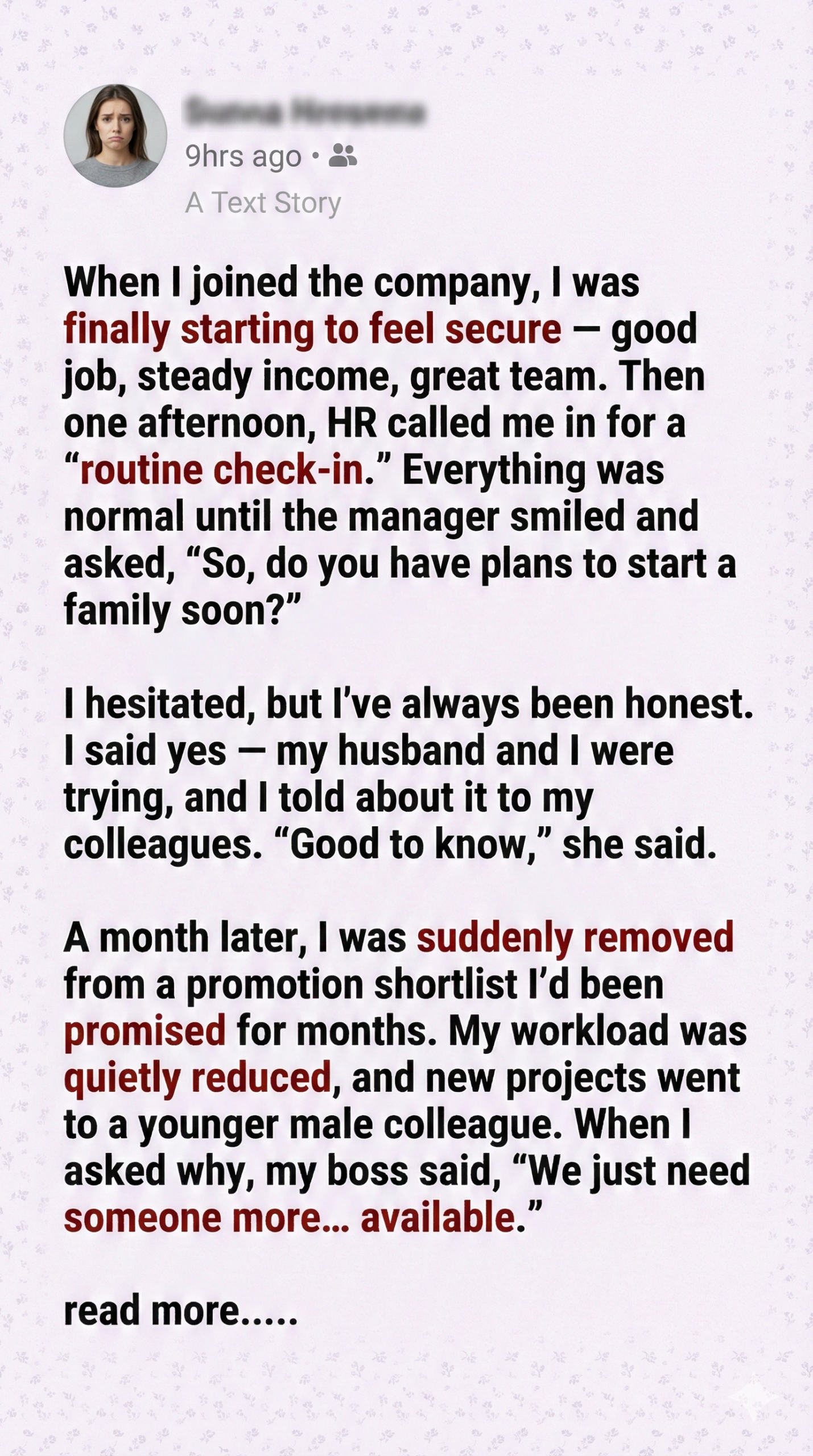 I did get pregnant months later—and this time, HR handled it professionally. I took my leave, returned, and was welcomed back with respect. It wasn’t perfect, but it was progress. I realized that silence protects systems that thrive on control. Speaking up is uncomfortable, but necessary.