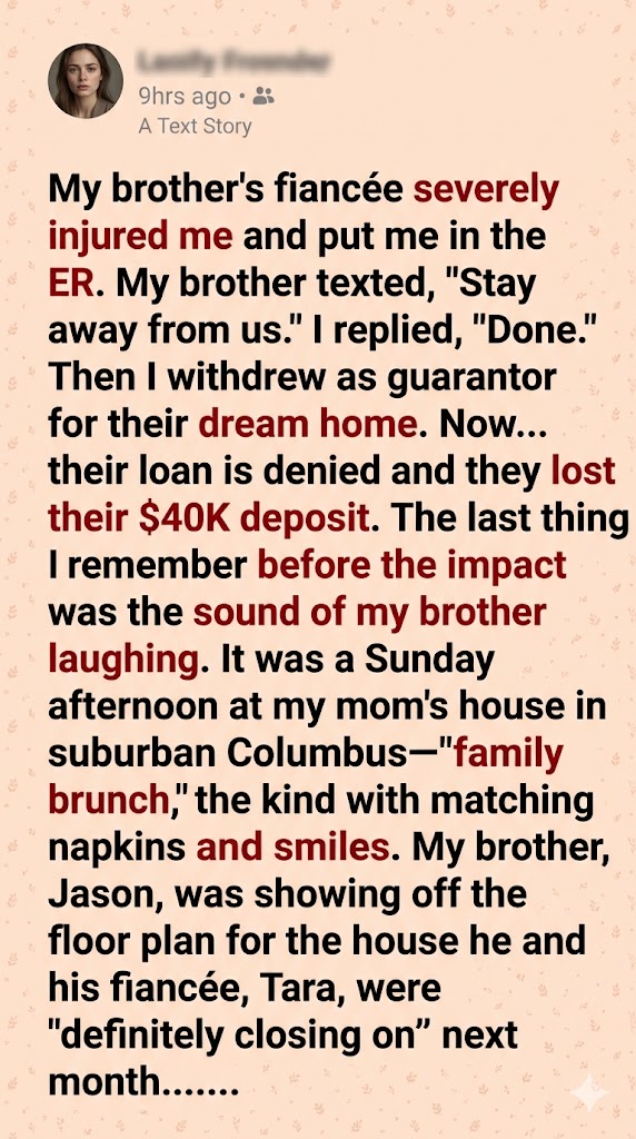 My brother’s fiancée severely injured me and put me in the ER. My brother texted, “Stay away from us.” I replied, “Done.” Then I withdrew as guarantor for their dream home. Now… their loan is denied and they lost their $40K deposit.