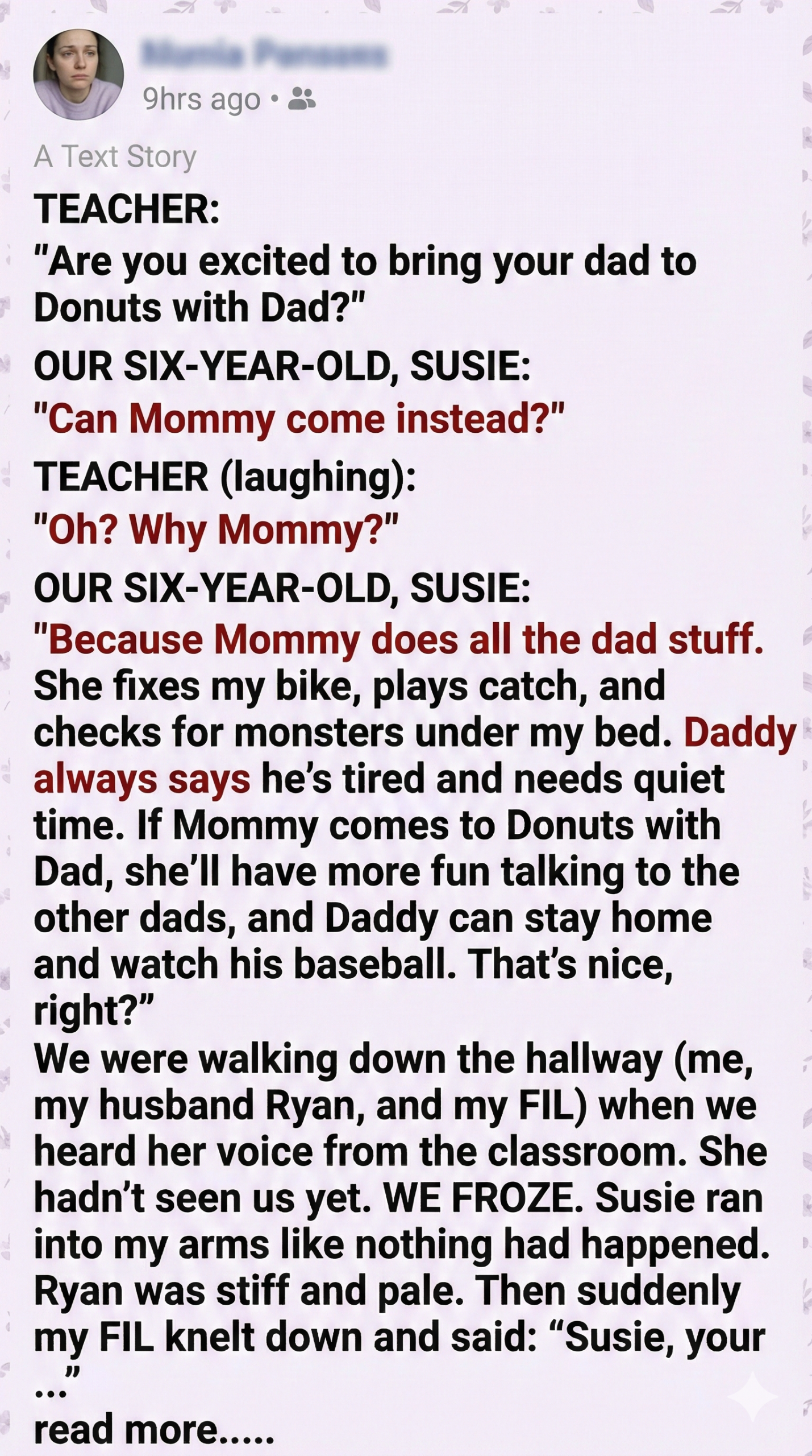 Ryan had taken the afternoon off, which was rare, and his dad, Tom, had come along to pick up Susie with us. The school was buzzing with flyers and glittery posters about “Donuts with Dad”, an annual event that made every child buzz like soda bubbles. The high-pitched excitement and sugar-coated anticipation were loud and addictive.