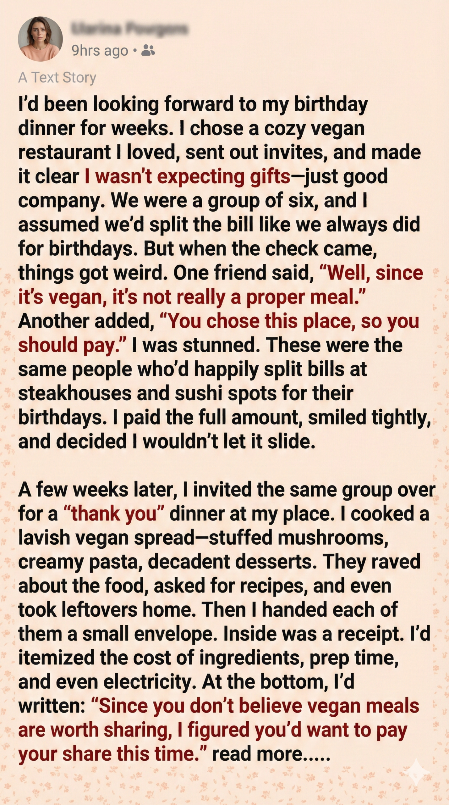 For my birthday, I invited my close friends to a cozy vegan restaurant I’d been dying to try. I’d made the reservation, picked the menu, and was excited to celebrate with people I cared about. But when the bill came, they refused to split it, saying, “We didn’t eat much—it’s vegan.” I was stunned. It wasn’t about the money—it was the principle. They’d enjoyed the evening, laughed, toasted, and yet treated my lifestyle like a burden. I paid the bill quietly, but inside, I knew this wasn’t just about dinner. It was about respect. And I wasn’t going to let it slide.