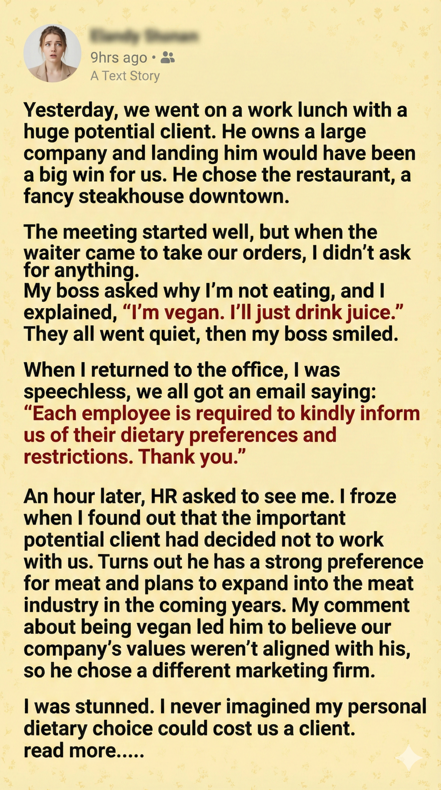 I’d only been at the marketing firm for five months when we landed a high-stakes lunch with a major potential client. He chose a downtown steakhouse, and while everyone ordered, I quietly declined. “I’m vegan,” I said, opting for juice. The table went silent, my boss smiled awkwardly, and I thought nothing of it—until we got back to the office. An email from HR asked everyone to submit dietary preferences. Then came the real blow: the client had backed out. My lifestyle choice had apparently signaled misalignment with his meat-centric business plans.