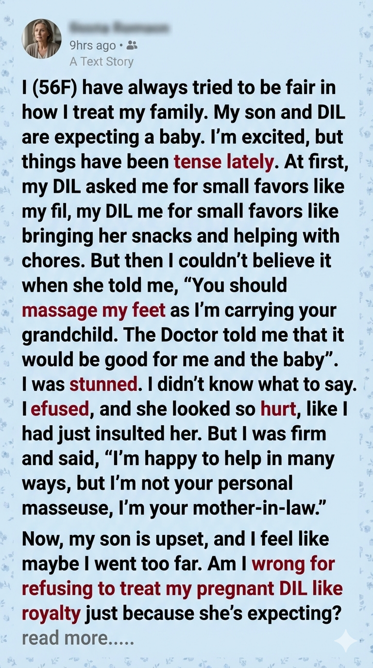 The mother-in-law, 56, begins her story with a mix of excitement and unease—her son and daughter-in-law are expecting their first child, but tensions are rising. Initially, she gladly helped with small tasks, but things escalated when her pregnant DIL demanded foot massages, citing medical advice and the fact that she was carrying the MIL’s grandchild. The MIL was stunned and refused, insisting she was not a personal servant but a supportive family member. Her refusal hurt her DIL and angered her son, leaving her questioning whether she’d crossed a line.